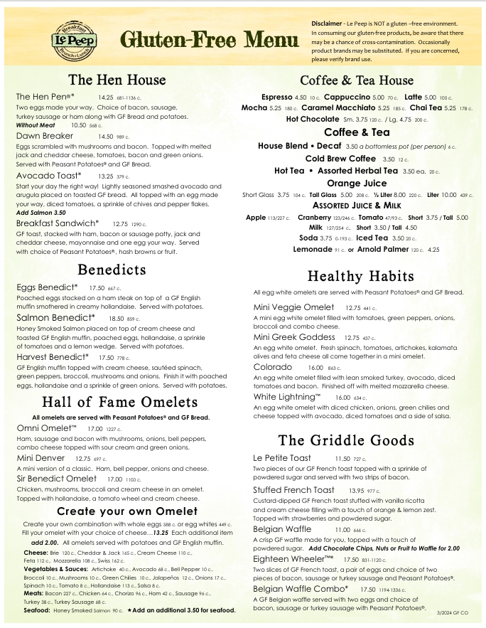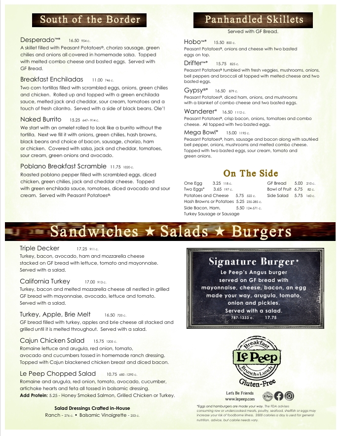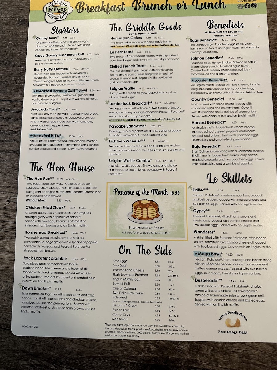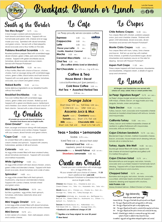 The menu at Le Peep® Wildcat offers a delightful variety of breakfast and lunch options, making it a great spot for any meal of the day. For those seeking a sweet start, options like the Breakfast Banana Split™ Bowl and Gooey Buns™ are perfect choices. If you're in the mood for something savory, try the Breakfast Croissant Sandwich or the Chicken Fried Steak. Skillet lovers will enjoy dishes like the Mega Bowl or Desperado™, while the South of the Border section offers a flavorful Poblano Breakfast Scramble and Breakfast Burrito. Benedict enthusiasts can indulge in the classic Eggs Benedict or the more adventurous Lobster Benedict. The griddle goods section features a rotating Pancake of the Month and the indulgent Stuffed French Toast. For a lighter option, the Omni Omelet™ or the Cape Cod Omelet are satisfying choices. Lunch options include the Chicken Avocado Croissant and the Ham & Swiss Croissant, while the crepes, such as Monte Cristo Crepes, bring a delicious twist to your meal. There are also fun options for kids, like the Funny Face Pancake and Jr. Chocolate Chipper. With so many diverse and flavorful options, Le Peep® Wildcat provides a satisfying dining experience for all tastes.